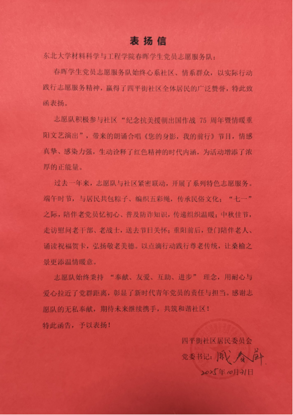 10月31日,东北大学材料科学与工程学院春晖学生党员志愿服务队收到马路湾街道四平街社区发来的表扬信。信中对志愿队参与社区“纪念抗美援朝出国作战75周年暨情暖重阳”文艺演出的表现给予高度评价,同时肯定了其一年来扎根社区、无私奉献的志愿服务精神,这成为学院践行为党育人、为国育才使命的生动注脚。