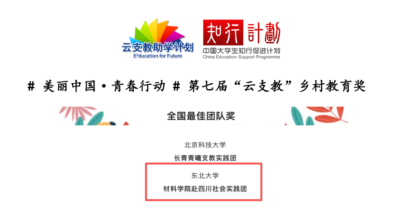 近日,由国家林草局宣传中心、全国关森委与中国大学生知行促进计划联合开展的#美丽中国·青春行动#第七届“云支教”乡村教育奖评选结果公布,材料学院赴四川社会实践团荣获“全国最佳团队奖”,全国仅10支团队获评此奖项。