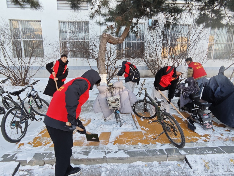 活动当天,志愿者们早早在新二舍A座、知行楼等师生高频通行区域集合,分组分工后便手持铁锹、雪铲等工具,投入到铲冰除雪工作中。清理积雪的同时,还提醒来往师生注意安全,做好防寒保暖。经过一个多小时的持续奋战,志愿者们成功清理了多处积雪和冰霜,校园道路重新变得畅通无阻,保障了师生们的出行安全。