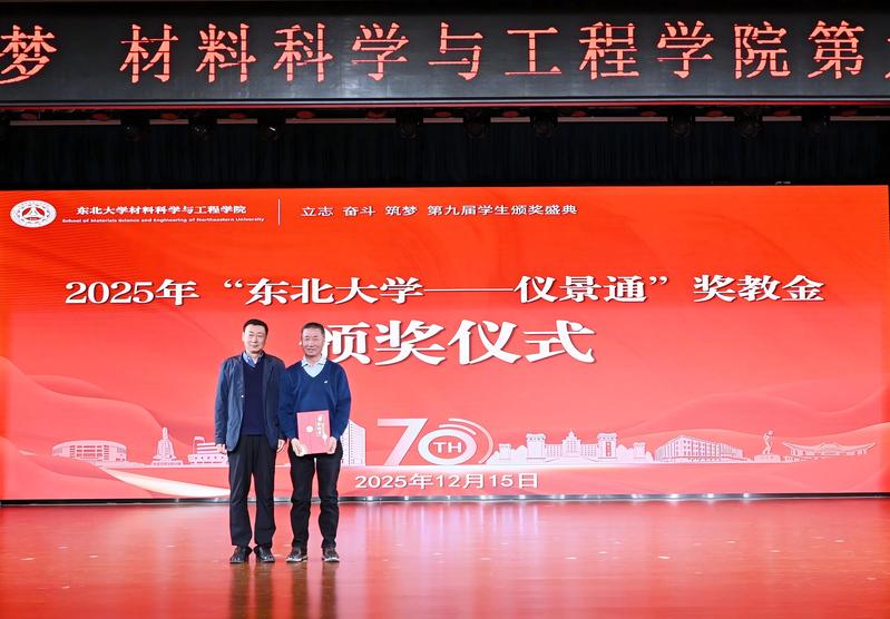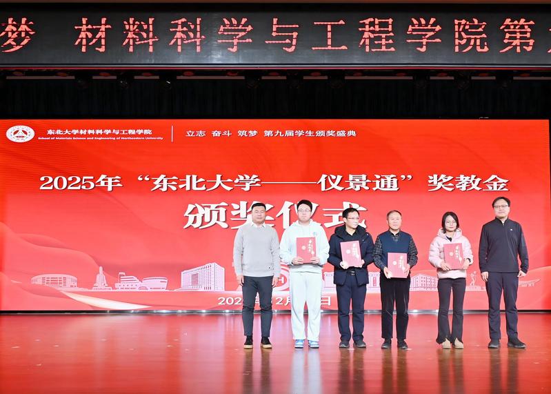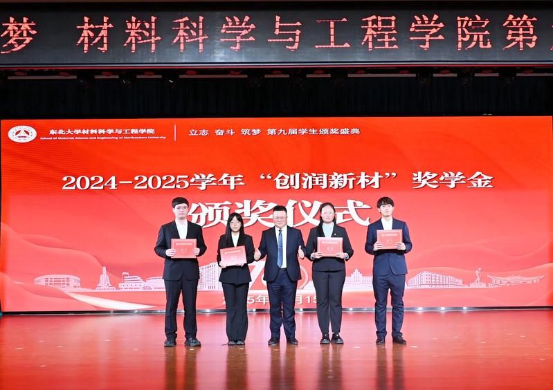 与会嘉宾为获奖学生和集体代表颁奖。 辽宁红银金属有限公司总经理李雪松、宁波创润新材料有限公司董事长吴景晖分别为“红银金属”奖学金、“创润新材”奖学金获奖学生颁奖。 仪景通光学科技(上海)有限公司材料科学科研负责人刘朝武、展成、于海钢分别为“东北大学--仪景通”奖教金获奖教师颁奖。王建军为“院长奖章”获奖学生颁奖。