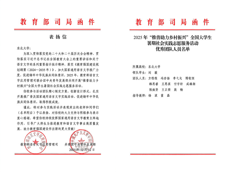 近日,教育部语言文字应用管理司、共青团中央青年发展部共同主办的2025年“推普助力乡村振兴”全国大学生暑期社会实践志愿服务活动评优结果揭晓,东北大学材料学院赴四川推普助力乡村振兴服务队荣获“优秀团队”称号,并获教育部语言文字应用管理司和共青团中央青年发展部来信表扬。