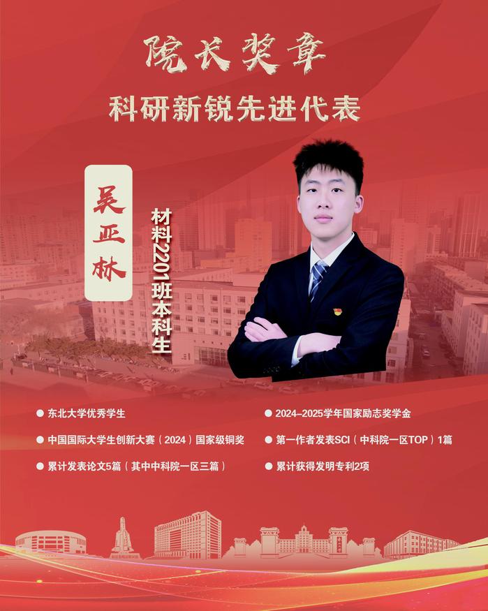 “于细微处探求真知,在创新中追逐梦想”是他科研道路上的生动写照。从实验室的反复求索到学术舞台的崭露头角,他以沉潜之心与卓越之志,为本科生涯绘就了浓墨重彩的科研篇章,展现了东大材料学子的无限潜能。他是“院长奖章”获得者——2022级本科生:吴亚林!