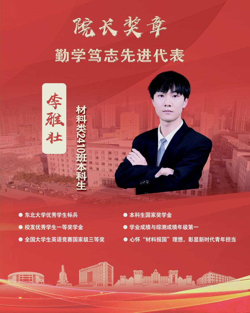“于逆境中开出希望之花,在坚守中铸就材料之魂”是他青春的宣言。他不尚浮华,专注耕耘,用一张张优异的成绩单,生动诠释了自强不息、矢志一流的材料人精神。他的故事,是一部用奋斗书写的励志教材,为全体同学树立了光辉的榜样。他是“院长奖章”获得者——2024级本科生:李雅壮!