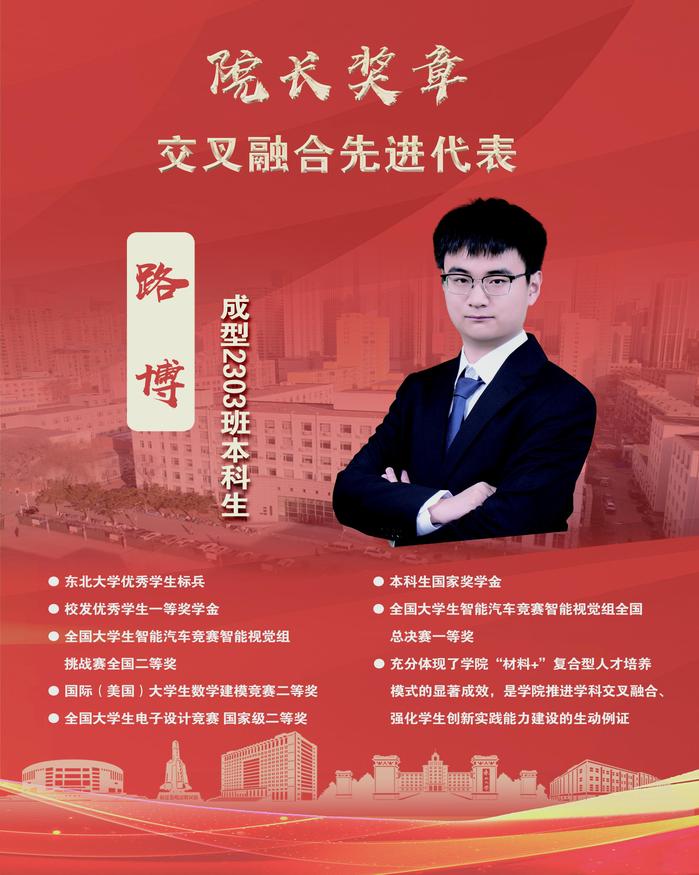 “扎根材料,跨界创新,做复合时代的破壁人”是他鲜明的奋斗姿态。他不被专业边界所限,主动学习、大胆突破,将代码算法与工程实践深度融合,生动诠释了新时代青年面向未来产业的核心素养。他是“院长奖章”获得者——2023级本科生:路博!