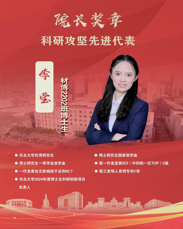 “心系国家能源战略,以关键材料创新驱动绿色未来”是她的科研志向。在实验室的日夜坚守中,在数据的反复验证里,她用实际行动诠释着新时代材料人的责任担当——将青春写进祖国科技强国的宏伟篇章。她是“院长奖章”获得者——2022级博士生:李莹!