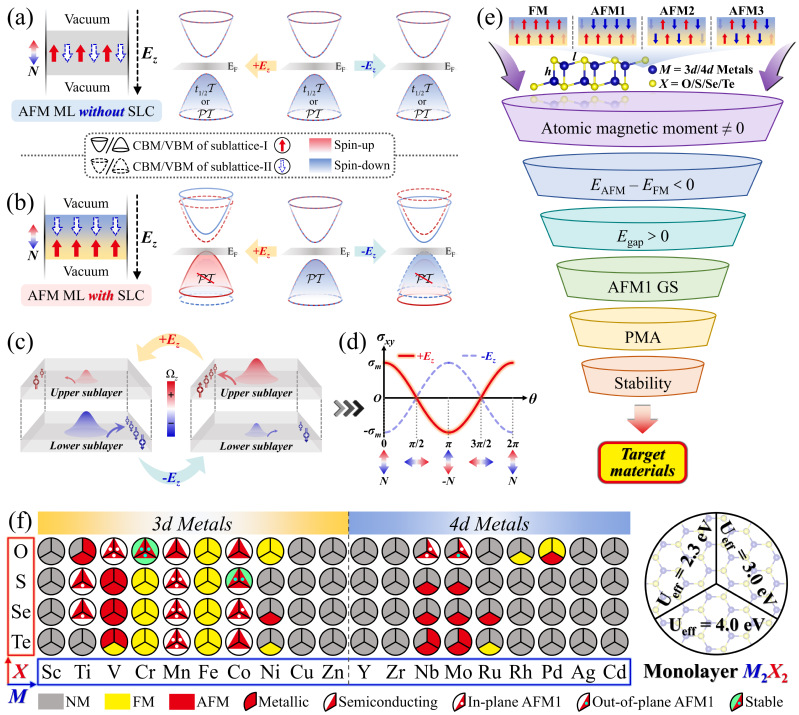 反铁磁材料由于无杂散场、抗外磁场干扰、以及具有超快动力学等特性,成为高速低功耗电子器件的核心候选材料。然而,由于宏观上缺少净磁化,反铁磁材料中信息的读取和写入是制约其应用的挑战性难题。该研究设计了具有自旋-层耦合与垂直磁各向异性的反铁磁单层材料,通过外电场打破材料的空间反演和时间反演联合对称性,诱导类塞曼效应的自旋劈裂,获得层锁定的自旋极化带边,进而产生非零的贝利曲率与反常霍尔电导,提出一种双栅极反铁磁原型电子器件。相关工作为原子尺度反铁磁材料设计和电子器件开发提供了新的研究思路。