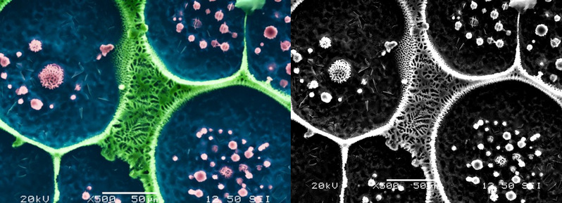 科学阐释:主体结构:呈现蜂窝状/多孔框架,由类六边形的“腔室”和网状“壁材”组成;壁材为Mg17Al12表面具有细密的微孔结构(多孔性特征);分散相:腔室内部及表面分布着两类颗粒—小尺寸的球形颗粒(直径约1~5 μm)、少量具有多孔纹理的不规则颗粒,亦为Mg17Al12相;整体状态:框架结构具有明显的连通性与孔隙分级特征(大腔室+壁材微孔+分散颗粒),底部暗黑色为Mg基体。