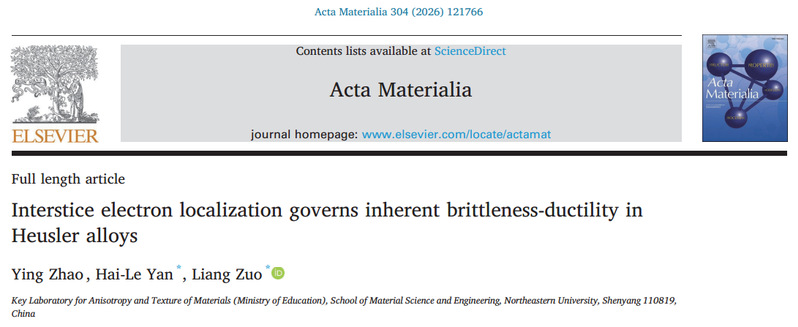 东北大学闫海乐副教授、左良教授团队在揭示Heusler合金韧脆性电子起源方面取得重要进展,其研究成果以“Interstice electron localization governs inherent brittleness-ductility in Heusler alloys(间隙电子局域性主导Heusler合金的本征韧脆性)”为题,发表在材料领域顶尖期刊《Acta Materialia》。该论文第一作者为东北大学材料科学与工程学院博士研究生赵莹,通讯作者为闫海乐副教授与左良教授,东北大学为论文唯一单位。