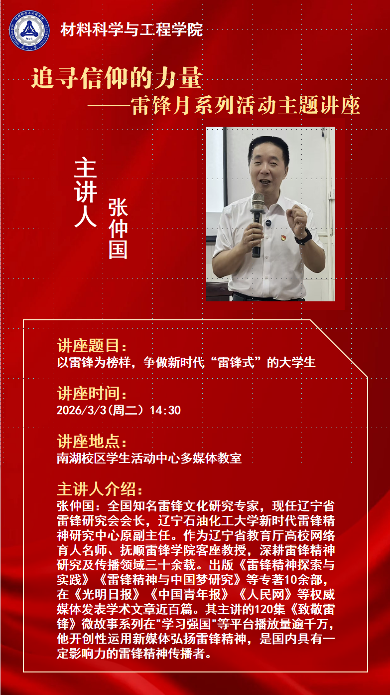 主讲人简介:张仲国,全国知名雷锋文化研究专家,现任辽宁省雷锋研究会会长,辽宁石油化工大学新时代雷锋精神研究中心原副主任。作为辽宁省教育厅高校网络育人名师、抚顺雷锋学院客座教授,深耕雷锋精神研究及传播领域三十余载。出版《雷锋精神探索与实践》《雷锋精神与中国梦研究》等专著10余部,在《光明日报》《中国青年报》《人民网》等权威媒体发表学术文章近百篇。其主讲的120集《致敬雷锋》微故事系列在学习强国”等平台播放量逾千万,他开创性运用新媒体弘扬雷锋精神,是国内具有一定影响力的雷锋精神传播者。