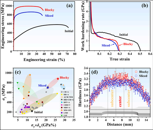 通过“三轴循环压缩+块体短时退火”的创新工艺,制备出具有宏观-晶粒-纳米跨尺度异构材料。材料内部形成梯度再结晶分布:高应变中心区域含13.3-18.1%再结晶晶粒与密集位错,低应变次中心区域再结晶比例为11.6-14.5%。在塑性变形过程中,不同样品位置和各位置的再结晶、未再结晶区依次激活塑性变形机制,促进应变在宏观样品和晶粒尺度的连续传递,有效抑制了局部颈缩和塑性失稳。与此同时,持续激活的位错滑移、层错、孪晶和双向相变,使材料在呈现高屈服强度(880 MPa)的同时,仍保持36%的断裂延伸率。