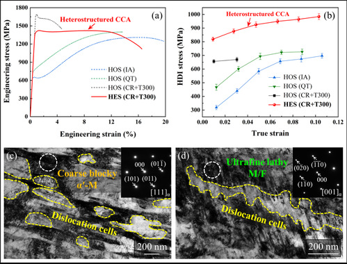 设计并制备出一种具有独特多重异质结构的Fe69.4Mn10Co10Cr10N0.6 (at.%)体心立方 合金,通过激活协同形变机制实现了优异的强塑性匹配。该合金主要包含由层状排列的亚微米级的超细板条晶组成的微米级块状α′-马氏体区、亚微米级超细铁素体板条区、亚微米级α′-马氏体和铁素体双相混合区以及位于二者相界面处或铁素体晶粒内部的富Cr和N的纳米析出相。这种由铁素体和α′-马氏体组成的层状异质结构是通过温轧、临界区退火和冷轧处理得到的,之后在回火及水淬过程中先后发生的奥氏体逆转变和马氏体转变导致显著的几何必需位错形成。上述独特的多重异质结构不仅贡献于合金由非均匀形变诱导的强化和硬化,而且增强了动态应变时效硬化,使经300 °C回火后的材料在室温拉伸试验中表现出优异的屈服强度 (1423 MP)和均匀延伸率 (10%)组合。高屈服强度主要来源于密度高达1015 m-2数量级的位错。形变过程中可动位错的滑移和位错胞形成促进了均匀塑性变形。
