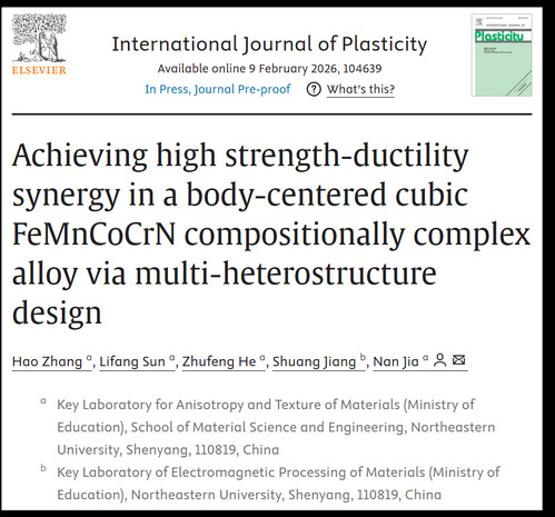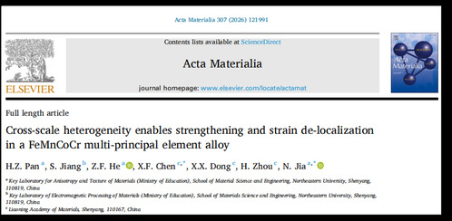 近日,东北大学材料科学与工程学院贾楠教授课题组在高强韧性异构高熵合金研究领域连续取得进展,相关成果分别发表于材料顶刊《Acta Materialia》(论文题目:Cross-scale heterogeneity enablesstrengthening and strain de-localization in aFeMnCoCr multi-principal element alloy)和《International Journal of Plasticity》(论文题目:Achieving high strength-ductility synergy in a body-centered cubic FeMnCoCrN compositionally complex alloyvia multi-heterostructure design)。东北大学为第一完成单位,博士研究生潘海正、张浩分别为论文第一作者,辽宁材料实验室为合作研究单位。