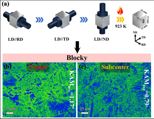 图1 “三轴循环压缩+块体短时退火”工艺示意图和材料不同位置的KAM图