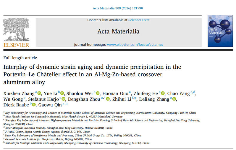 东北大学材料科学与工程学院周登山、张德良、秦高梧教授团队在Al-Mg-Zn基交叉铝合金的非稳态塑性变形研究方面取得重要进展,相关研究结果以Interplay of dynamic strain aging and dynamic precipitation in the Portevin-Le Chatelier effect in an Al-Mg-Zn-based crossover aluminum alloy为题,发表在材料领域权威期刊《Acta Materialia》上。论文第一作者为博士研究生张修臻,通讯作者为周登山教授。论文合作者包括德国马普可持续材料研究所李跃博士、魏绍楼博士和Dierk Raabe教授、上海交通大学杨超助理教授,以及日本J-PARC中心龚武博士和Stefanus Harjo博士等。