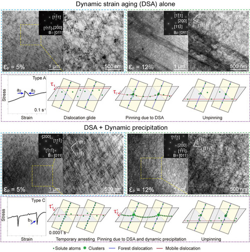 本研究以高Mg含量Al-Mg-Zn基交叉固溶合金为模型材料,结合室温拉伸评价(应变速率:0.00005-0.1 s-1)、高能XRD线形分析、TEM弱束暗场成像与3DAPT实验,发现螺位错主导塑性变形,并与溶质协同控制锯齿流变波形。变形初期螺位错占比超60%(图1),此后随应变增加逐渐降低,这与经典的刃位错认知形成鲜明对比。研究进一步揭示:高应变速率下(0.1 s⁻¹),螺位错发生频繁的局部交滑移并形成微观滑移带,引发A型锯齿;低应变速率下(0.0001 s⁻¹),DSA辅助Mg-Zn团簇动态析出,溶质团簇通过与滑移螺位错发生强相互作用抑制交滑移,进而促使位错形成Taylor晶格,最终引发C型锯齿(见图2)。