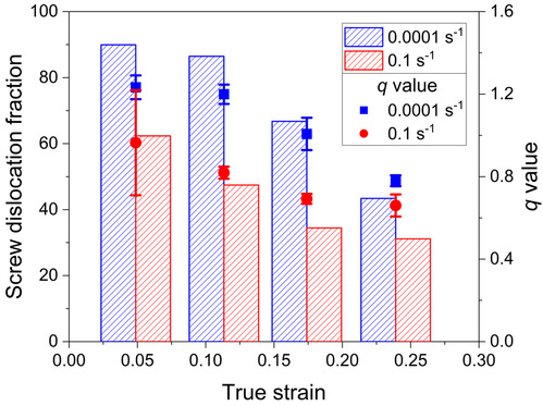 图1 不同应变速率下螺位错占比及q值随应变的变化关系图